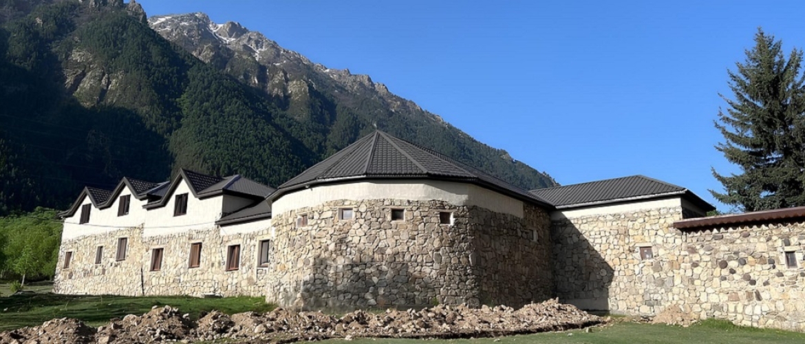 Здание гостиницы представляет собой одноэтажный корпус, оформленный в стиле средневековой кавказской крепости, который создает атмосферу уюта и безопасности. Внутренний двор отеля закрыт, что позволяет гостям наслаждаться спокойствием и уединением. Здесь гости могут остановиться в стандартных однокомнатных номерах, все из которых оборудованы современным душем и комфортной мебелью, что создает все условия для расслабляющего отдыха.