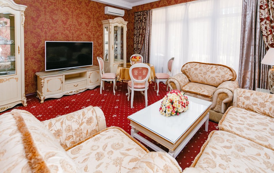 В номере: диван, комод, набор мягкой мебели, прикроватные тумбочки, стол, стулья, шкаф для посуды, кондиционер, телевизор, холодильник, электрочайник
