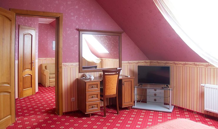 В номере: диван, зеркало, кровать двуспальная, прикроватные тумбочки, стол, стулья, кондиционер, мини-холодильник, сейф, телевизор ЖК, телефон