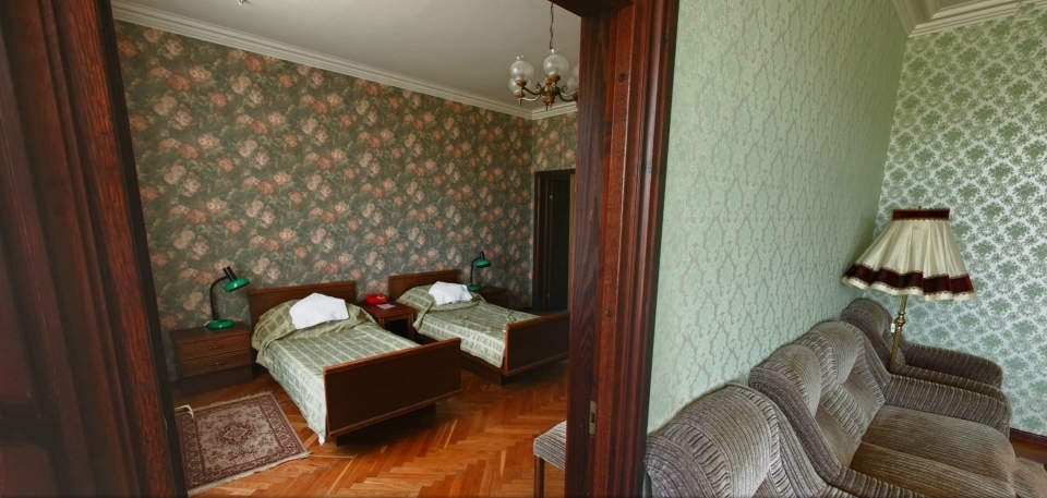 В номере: Кресло, диван, 2 кровати, торшер, шкаф, холодильник, телевизор, телефон, электрочайник.
